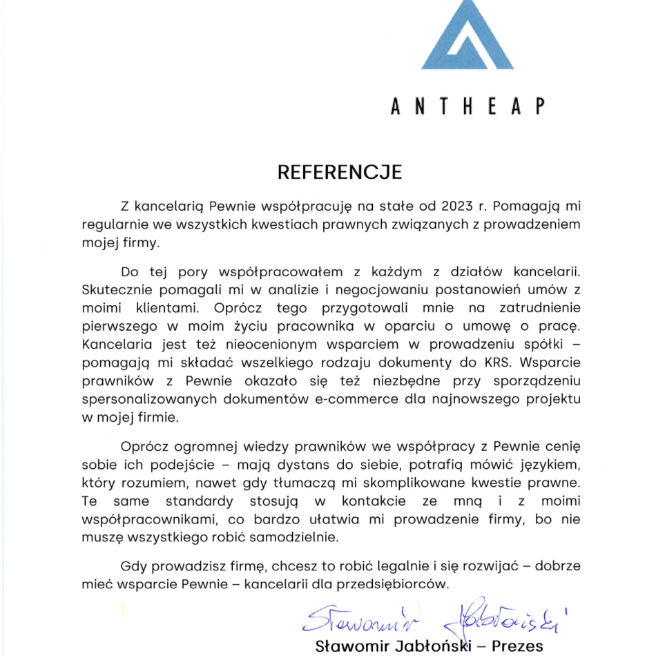 Mając powyższe na uwadze, możemy zdecydowanie polecić kancelarię jako rzetelnego i proaktywnego Partnera, który dostarcza nie tylko porady prawne, ale przede wszystkim strategiczne, zintegrowane rozwiązania biznesowe.
