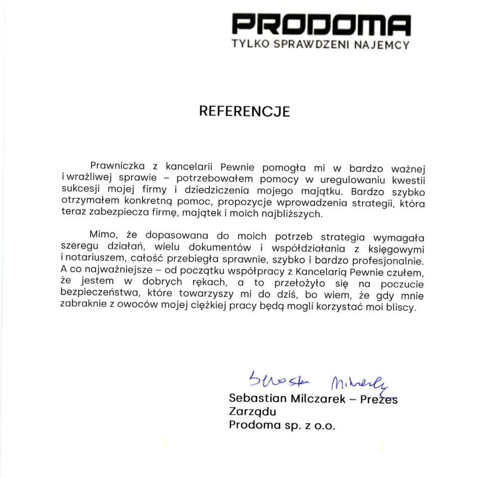 Prawniczka z kancelarii Pewnie pomogła mi w bardzo ważnej i wrażliwej sprawie – potrzebowałem pomocy w uregulowaniu kwestii sukcesji mojej firmy i dziedziczenia mojego majątku. Bardzo szybko otrzymałem konkretną pomoc, propozycje wprowadzenia strategii, która teraz zabezpiecza firmę, majątek i moich najbliższych.